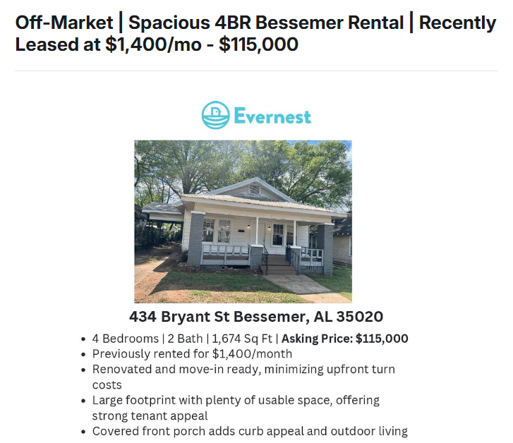💸 Off-Market Deal: Spacious 4BR Bessemer Rental | Recently Leased at $1,400/mo